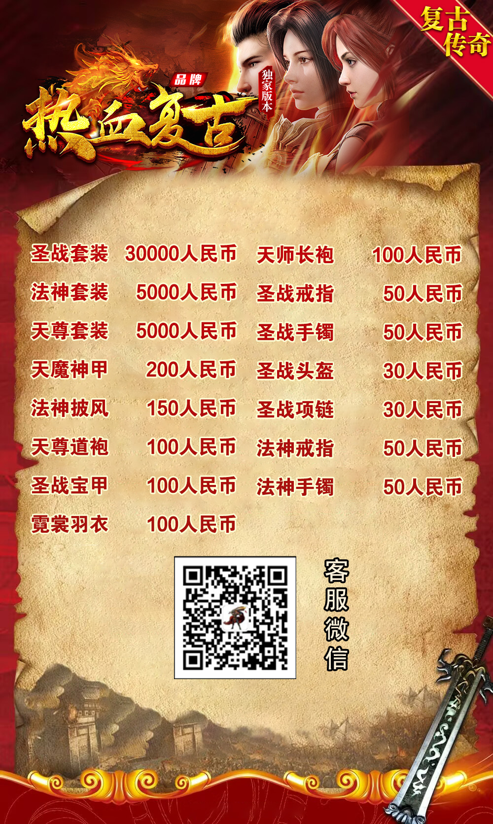 【职业平衡】:精心把三职业的均衡做到了极致,法师打宝,道士辅助,战士双烈火PK越货。